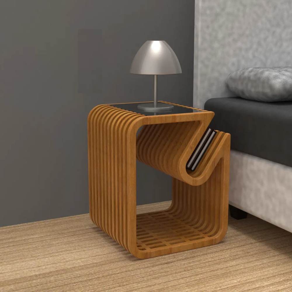 Mesilla de noche minimalista, Velador de noche moderna. Contiene vidrio en cara superior. Madera de Pino contrachapada. Diseño Europeo Moderno.
